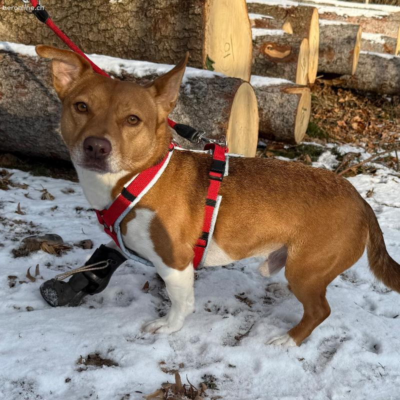 Durch seine Radialeslähmung, ist der Spaziergang führ ihn sehr anstrengend, weshalb diese eher kürzer sind. Um die anderen drei Beine zu entlasten und dass er das vierte Bein auch brauchen kann, hat er seit Januar 2024 eine Orthese, welche sein Bein, auf den Spaziergängen stabilisiert. Damit er auch ohne Orthese rennen kann, muss in seinem neuen Zuhause ein gut eingezäunter Garten vorhanden sein.