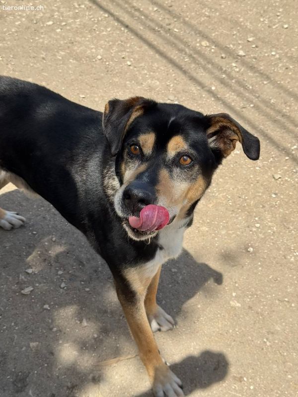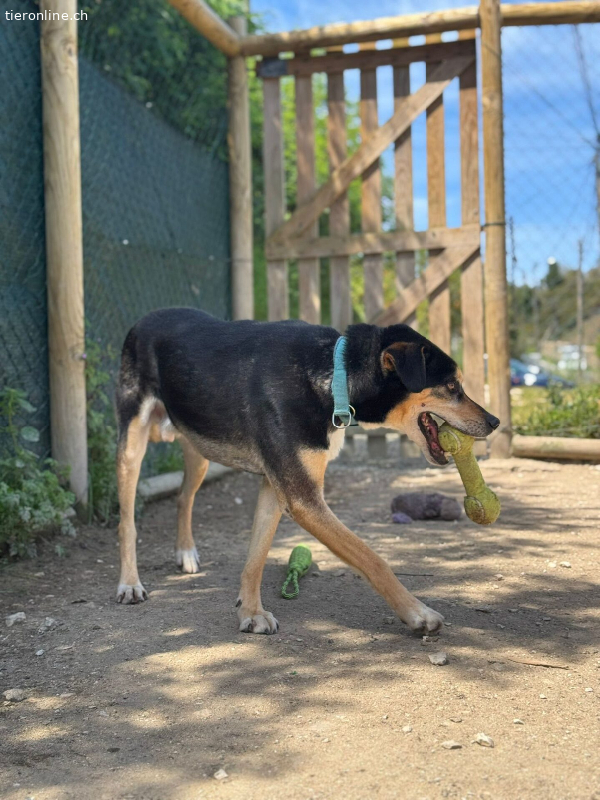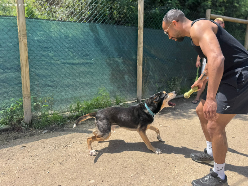 Er zeigt sich sehr glücklich draußen im Spielbereich und rennt gerne etwas, um aufgestaute Energie abzubauen. Wenn er dann zufrieden ist, kommt er gerne zu den Freiwilligen und holt sich etwas Streicheleinheiten und Liebe ab.