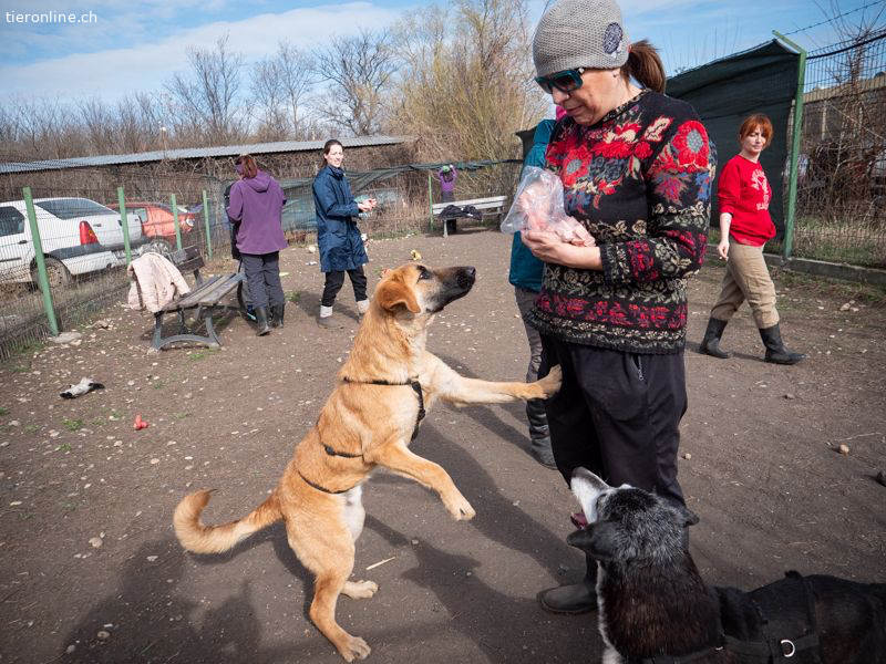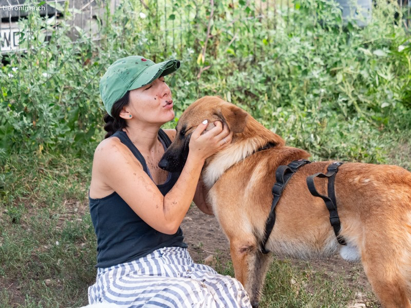 Im Tierheim Odai wurde beim Erstaufnahme-Check gleich festgestellt, dass Huck ein sehr freundlicher Hund ist. Und da er nicht in den „Tiefen des großen Tierheims“ verschwinden sollte, behielt man ihn gleich vorne im Sozialisierungstrakt, sodass er nun sonntags die Möglichkeit bekommt, dass die Freiwilligen mit ihm arbeiten und ihn besser kennenlernen können. Mit „arbeiten“ ist hier gemeint: Huck darf das Laufen an Geschirr und Leine üben und er darf mit den Menschen und anderen Hunden auf den Hundespielplatz, wo er sich austoben kann und Sozialkontakte knüpfen darf.
