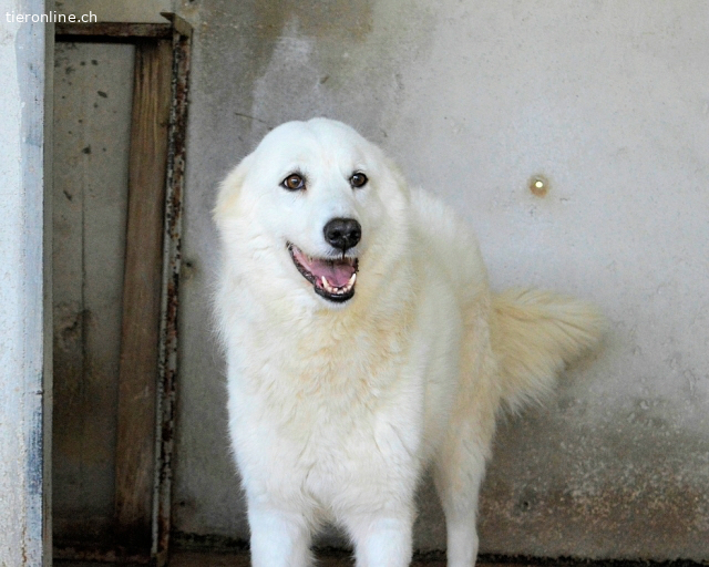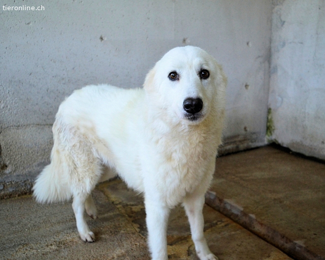 Da ist diese bildhübsche Hündin: ein Traum in Weiß, mit tiefen braunen Augen und lackschwarzer Stupsnase. Ein Maremmano (Mix) wie aus dem Bilderbuch.