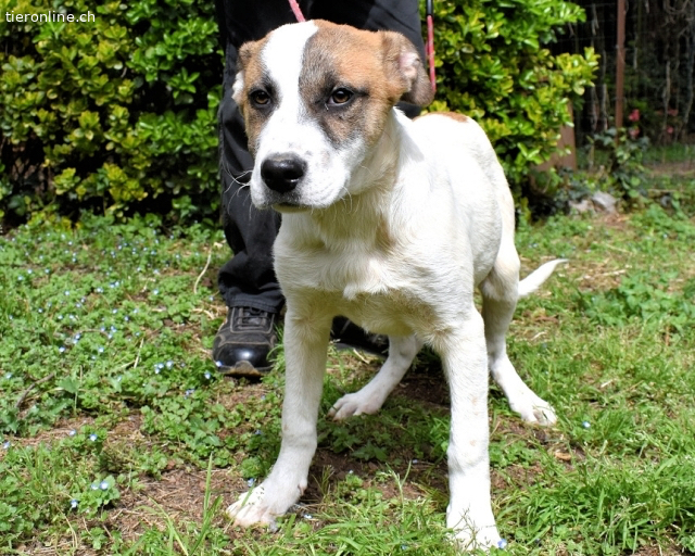 Sie fühlen sich geblendet? – Nein, liebe Leser, dieses Licht kommt nicht von seinem hellen Fell. Es kommt von ihm, tief aus seinem kleinen Welpenherz. Elenio ist noch so klein, vermutlich denkt er, das hier ist sicher nur ein Zwischenstopp. Ein verdammt blöder. – Im Grunde hat er da recht, zumindest wäre es nicht ganz so schlimm, wenn die Hunde nur kurzzeitig dort bleiben würden. Doch manche bleiben so lang, dass ihre kleine Flamme der Hoffnung von der Angst ausgepustet wird. Und manches Vertrauen. So wird es auch bei Elenio sein. Er ist noch nicht lange im Hundelager, er kam am 31. Januar mit seiner Schwester Eloria dort an. Leider hatte er auch eine Flohdermatitis, von der Kinn, Hals und Pfoten betroffen waren. Aber er erholt sich schon davon.