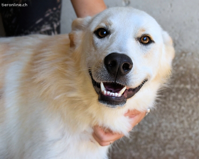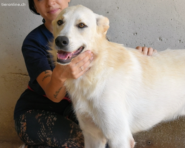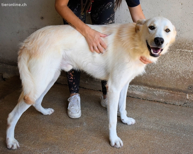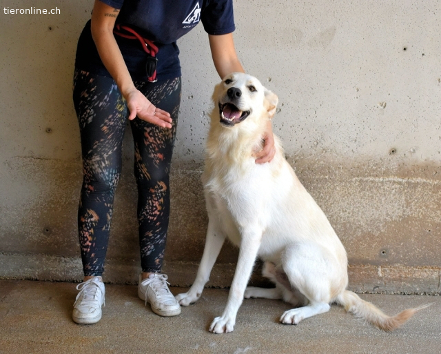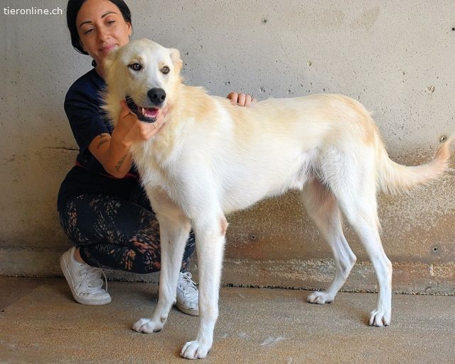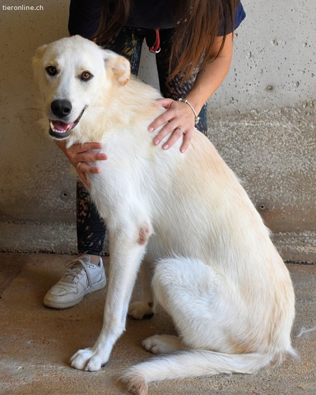 Dieser weiße Hund gehört nicht ins Grau des Zwingers, sondern in Ihr Leben – sprechen Sie mit unserer Vermittlerin und machen Sie jeden Tag zum Konfettifest.