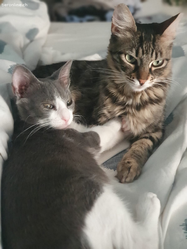 Die beiden wurden zusammen gepflegt und sind unzertrennlich geworden, sie schlafen, essen und spielen den ganzen Tag zusammen. Jasmine ist so süß und auch kuschelig. Stevie ist manchmal noch ein wenig schüchtern aber er hat schnell Vertrauen und ist dann auch sehr anhänglich. Wir würden die zwei Schätzchen gerne zusammen vermitteln.